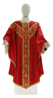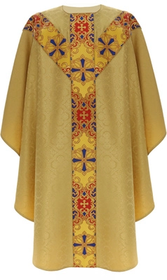 ( ilość produktów: 5 )Wśród wielu rodzajów szat liturgicznych oferowanych przez nasz sklep, znaleźć można również efektownie zdobione ornaty semi gotyckie, wykonane z doskonałej jakości materiałów takich jak adamaszek, dostępne w różnych kolorach – na każdy okres liturgiczny. Wszystkie ornaty semi gotyckie oferowane są wraz ze stułą, a w wybranych modelach do zestawu dochodzi także dalmatyka, bursa, welon kielichowy oraz manipularz. Ornaty oferowane są w standardowym rozmiarze 130cm dł. i 160cm szer. Możliwa jest również sprzedaż ornatów o innych rozmiarach, po uprzednim kontakcie. Każdy ornat posiada bogate zdobienia w postaci haftów przedstawiających różne motywy – zależnie od konkretnego modelu. Hafty naniesiono na pasy materiału biegnące przez całą długość ornatu. Dodatkowo wykonano je z niezwykłą wręcz precyzją, co tylko podkreśla oryginalny i niezwykle elegancki charakter tego typu stroju.