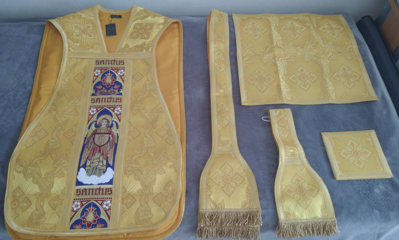 Zestwa zawiera: ornat rzymski, stułę, manipularz, bursę oraz welon kielichowy